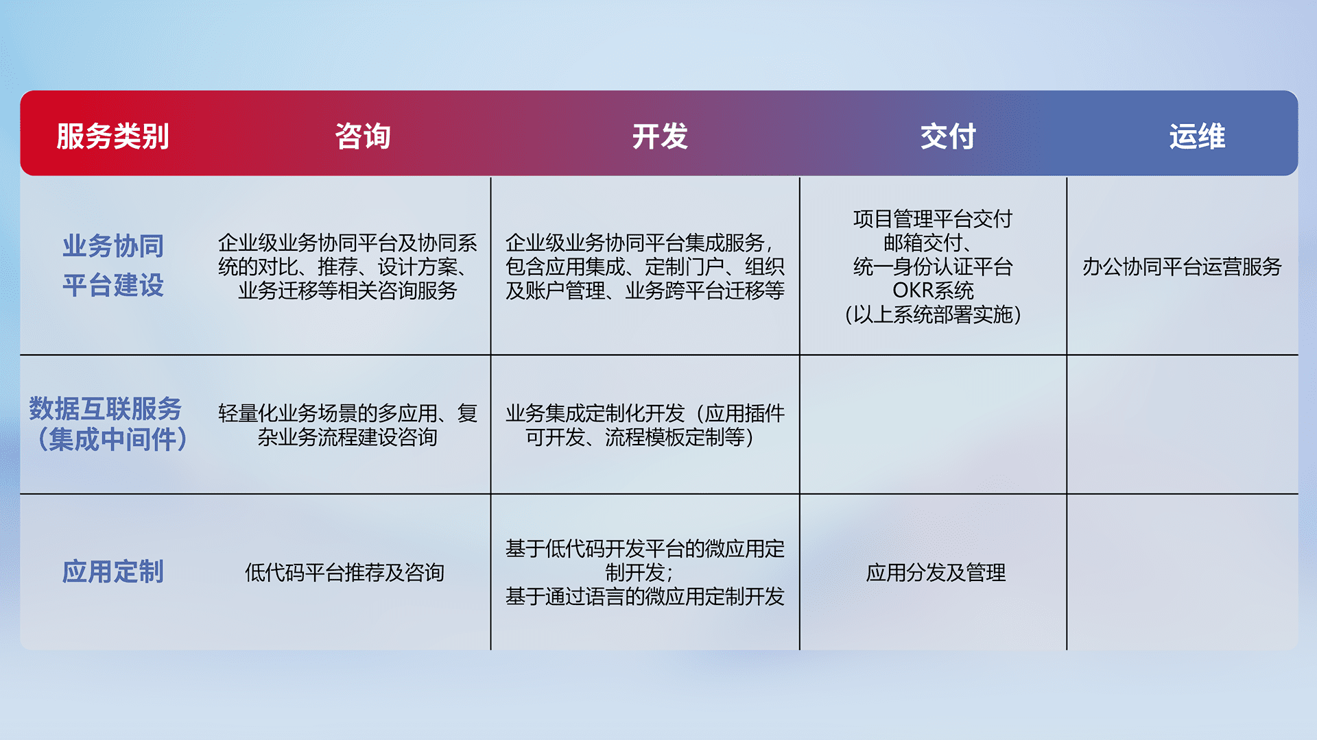 针对钉钉、、企微、、、IDaas等平台级产品提供产品的规划、、、、方案、、、交付、、定制化开发等服务,,,实现如统一协同办公、、智能客户服务、、混合会议管理、、智能数据查询、、等业务场景,,实现数字化转型。。。