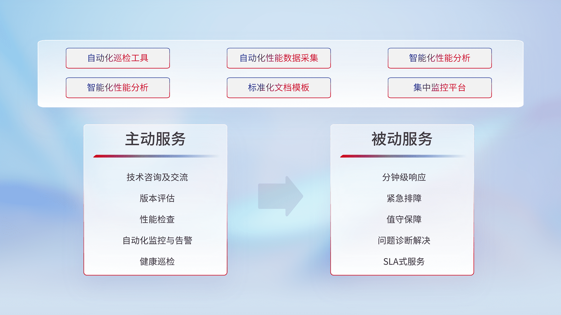 智能化工具和标准化文档,,,保障服务质量,,,,提供主动服务(包含技术咨询、、版本评估、、、、性能检查、、自动化监控与告警、、健康巡检)和被动服务包含(分钟级响应、、、紧急排障、、、值守保障、、问题诊断解决、、、、SLA服务)。。